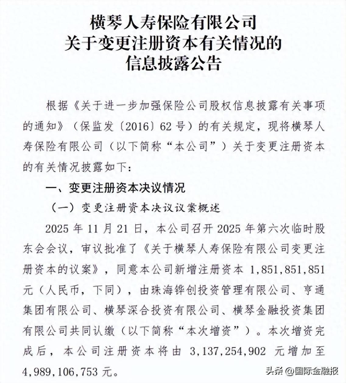 其中,18.52亿元计入公司注册资本。增资完成后,横琴人寿注册资本将由31.37亿元增加至49.89亿元。上述变更注册资本事项待广东金融监管局批准后生效。