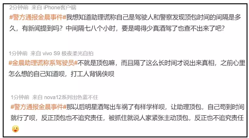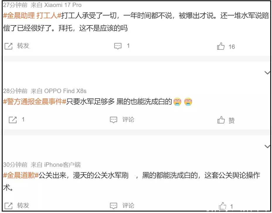 ——有网友发现,金晨道歉时机相当微妙,前脚通报一出,后脚道歉就来了,间隔不过几分钟,若不是双方关于伤势描述不一致,都要觉得他们提前商量好了,同时质疑金晨下水军洗白。