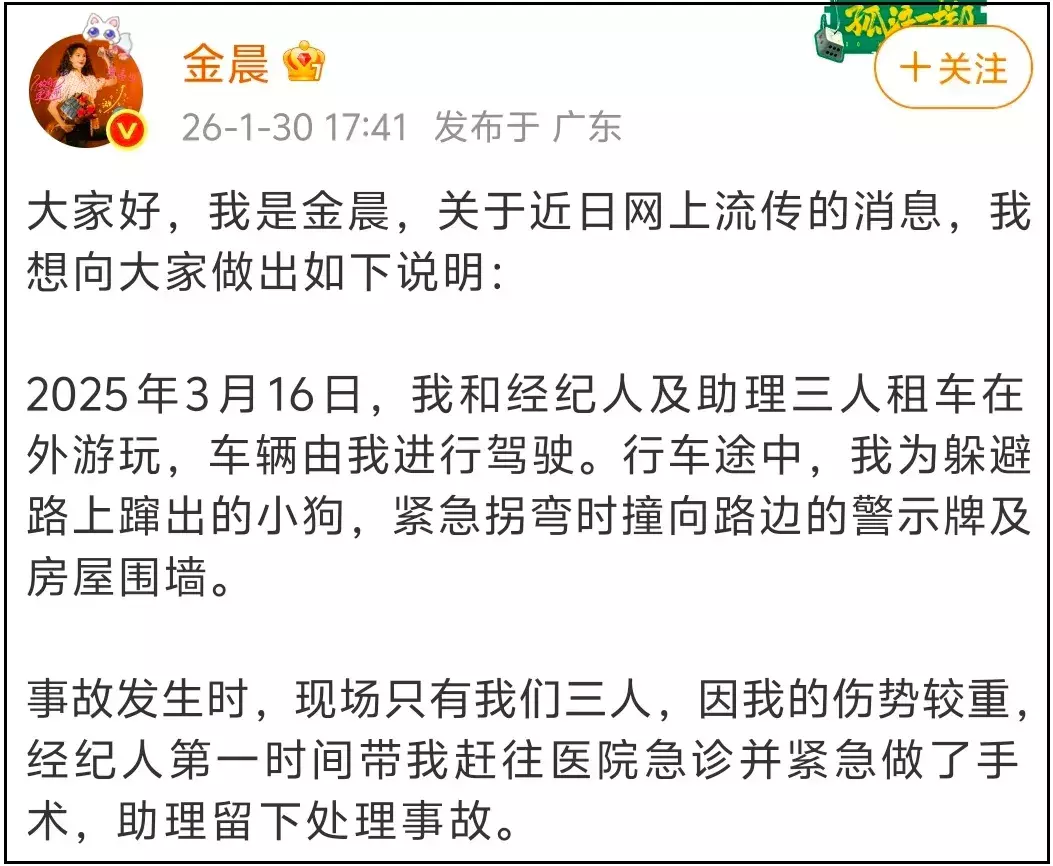 注意四个重点:1.金晨开的车是租的;2.开车的是金晨;3.金晨为了躲避小狗,撞到了警示牌和房屋围墙;4.金晨之所以离开现场,是因为伤势较重,经纪人带着她赶往医院急诊并做了手术。